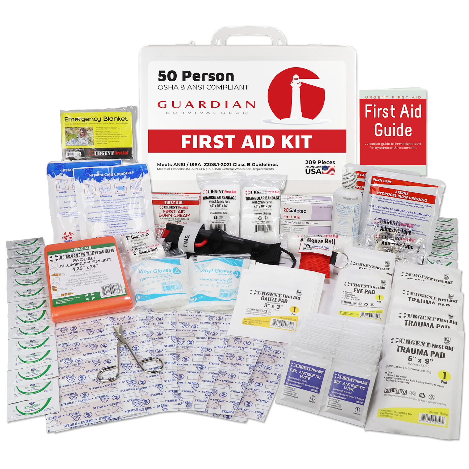 Guardian Survival Gear First Aid Kit, 209 Pieces, ANSI Class B, 25 to 50 Person in a lightweight, yet durable gasketed plastic case that is both portable and wall mountable. Meets ANSI case types I, II, III. This kit meets or exceeds OSHA and ANSI 2021 Standard fill requirements, so you know you and your employees will be covered with the new ANSI 2021 requirements. This ANSI First Aid box includes the assortment and quantity of first aid supplies intended to deal with most types of injuries and sudden illnesses encountered in the workplace including: major wounds, minor wounds (cuts and abrasions), minor burns, sprains and strains, and eye injuries. The Guardian Survival Gear first aid ANSI B kit is great for workplaces ranging from offices to production facilities and warehouses of up to 50 people, and is easily wall mounted, or removed to be taken to the accident scene.