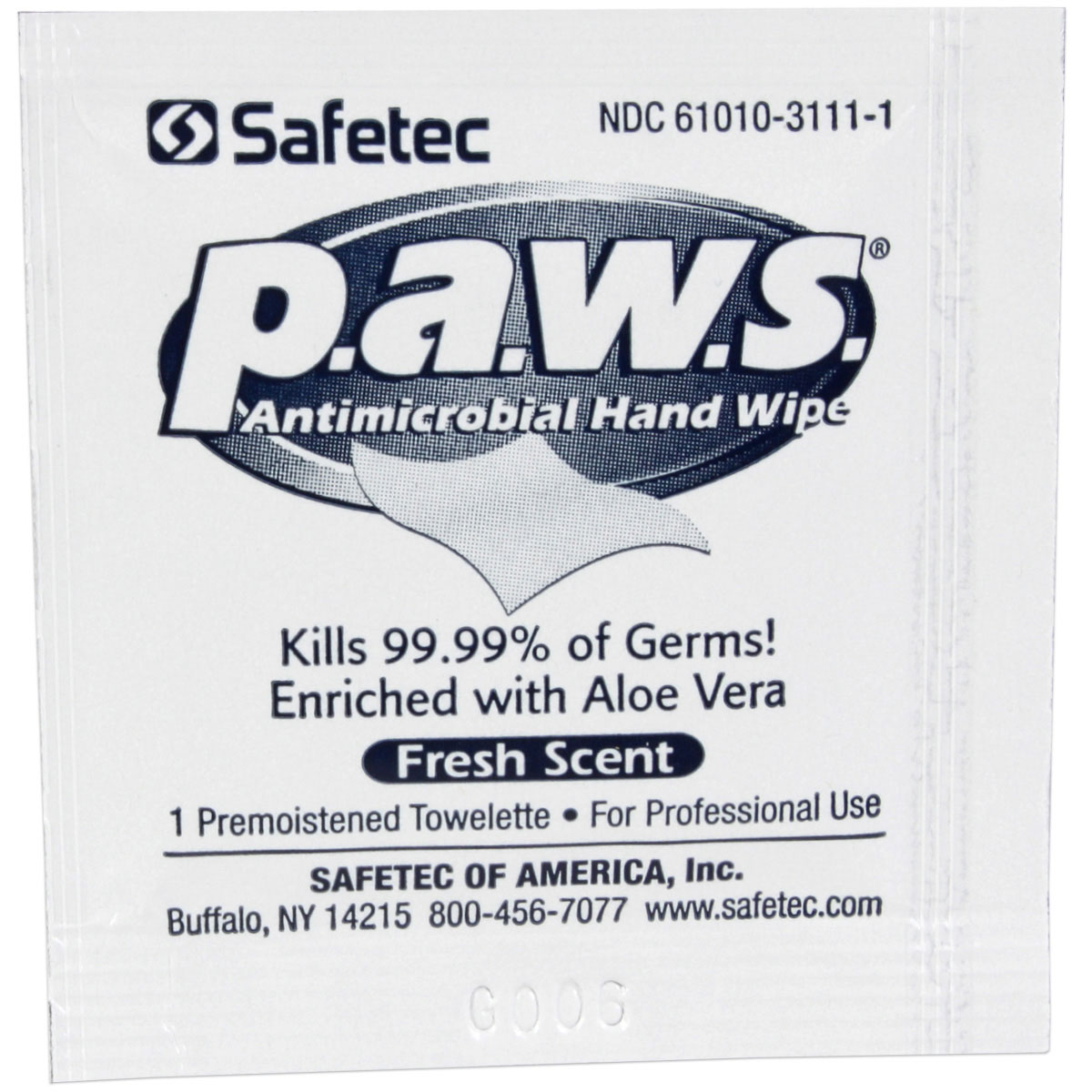 Safetec® p.a.w.s.® Antimicrobial Hand Wipes Helps Reduce the Risk of Cross-Contamination and Infection Formulated with 66.5% ethyl-alcohol to help you meet CDC, APIC and OSHA handwashing recommendations. P.a.w.s.® wipes sanitize while removing soil and debris from hands, an important function in the absence of soap and water. Convenient packaging is great for first aid kits, the office, purses, bags, hospitals, vehicles and workshops. Make hand hygiene a priority at your facility! Provide p.a.w.s.® to your staff for effective, proven protection against potential infections and germs.