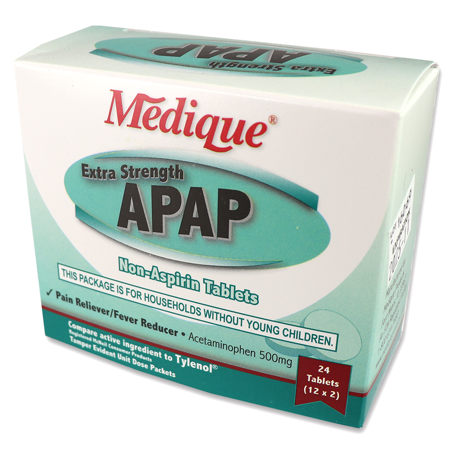 Extra Strength APAP, 24 tablets per box, 12 packets of 2 tabs